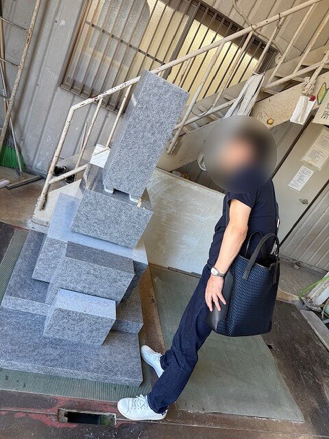 庵治石、特に細目極上をご注文いただいたい際には、必ず検品を行っております。今回はお施主様もご一緒です。